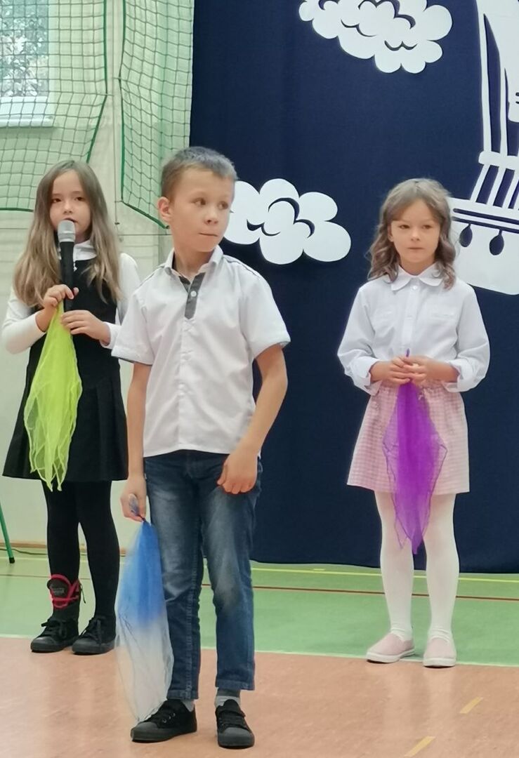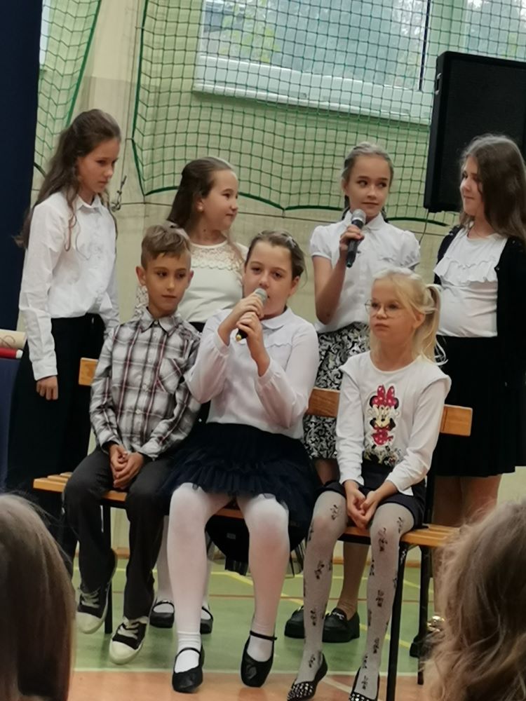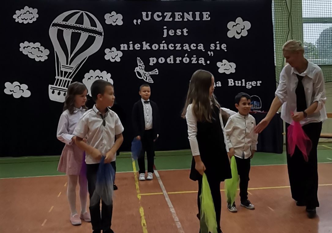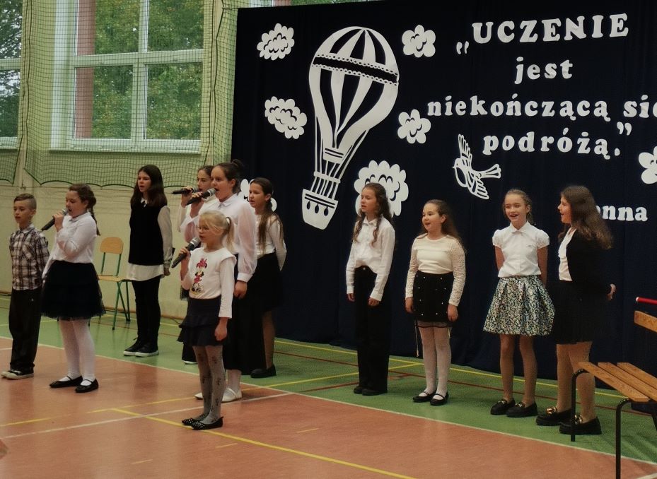 Program artystyczny przygotowali uczniowie klas III-V. Julia Jakubowska i Martyna Owczarek przywitały zgromadzonych gości i przyjaciół naszej szkoły. Swoją obecnością zaszczycili nas zastępca Burmistrza Gminy i Miasta Mirosławiec Pan Dariusz Bartosik oraz Przewodnicząca Rady Rodziców Pani Agnieszka Januszewska. Uczniowie klasy III i IV przygotowali, krótką scenkę z życia szkoły pt. „Koszmarny Dzień Edukacji”. Piosenką i słowem uświetnili ten wyjątkowy dzień. Wiele ciepłych i miłych słów popłynęło w kierunku nauczycieli oraz pracowników administracji i obsługi.