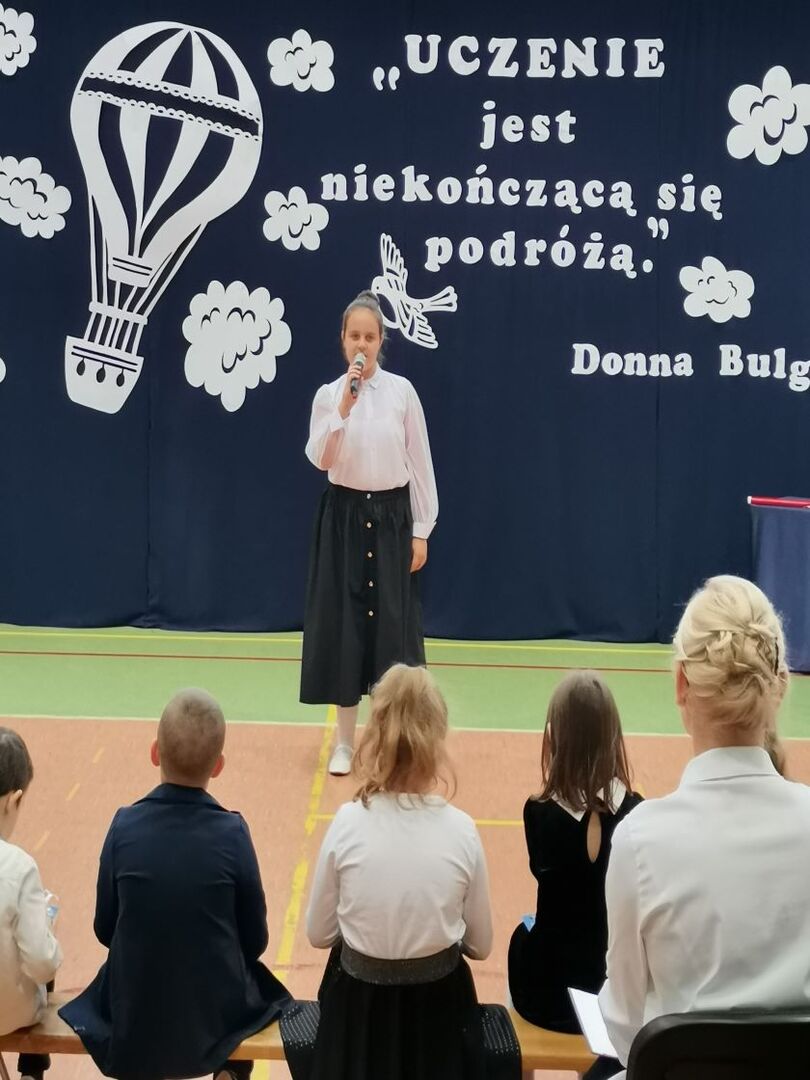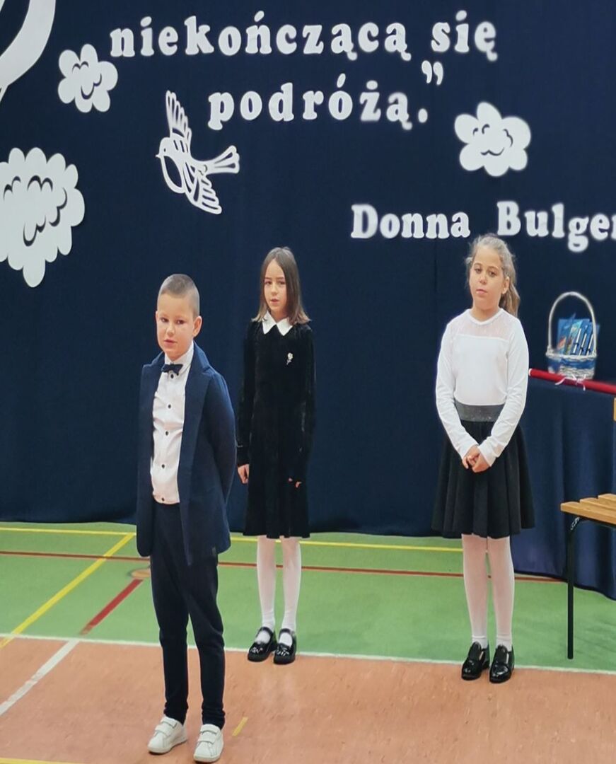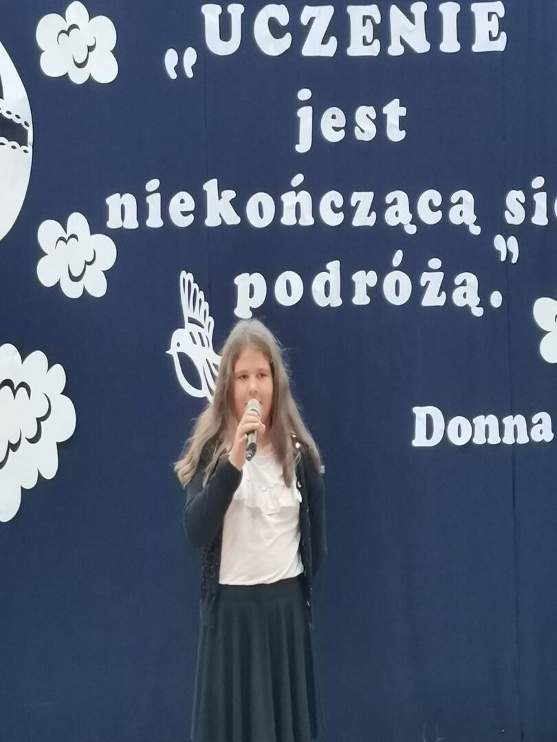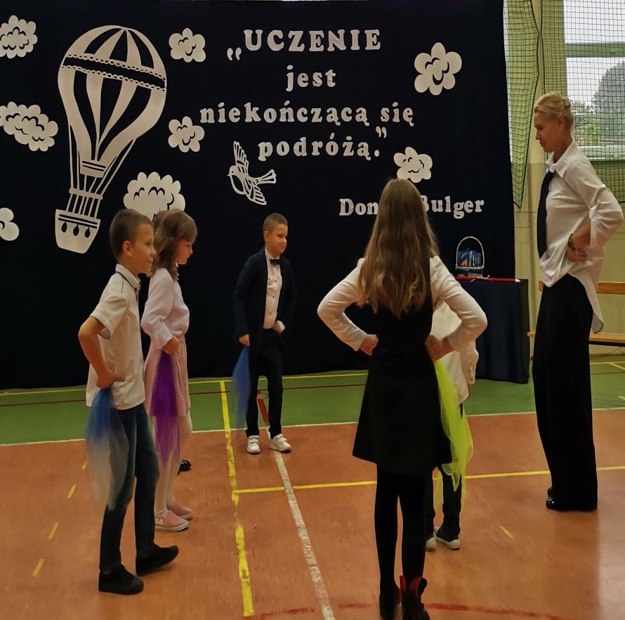 Program artystyczny przygotowali uczniowie klas III-V. Julia Jakubowska i Martyna Owczarek przywitały zgromadzonych gości i przyjaciół naszej szkoły. Swoją obecnością zaszczycili nas zastępca Burmistrza Gminy i Miasta Mirosławiec Pan Dariusz Bartosik oraz Przewodnicząca Rady Rodziców Pani Agnieszka Januszewska. Uczniowie klasy III i IV przygotowali, krótką scenkę z życia szkoły pt. „Koszmarny Dzień Edukacji”. Piosenką i słowem uświetnili ten wyjątkowy dzień. Wiele ciepłych i miłych słów popłynęło w kierunku nauczycieli oraz pracowników administracji i obsługi.