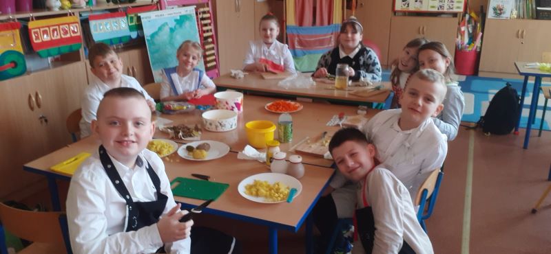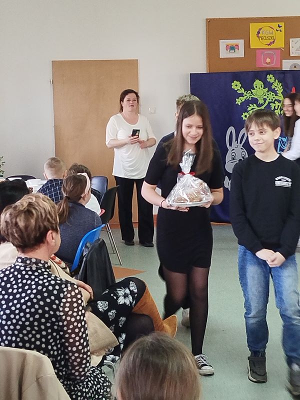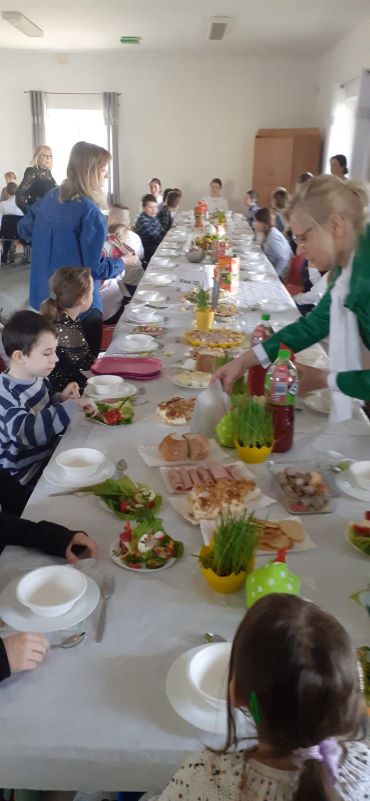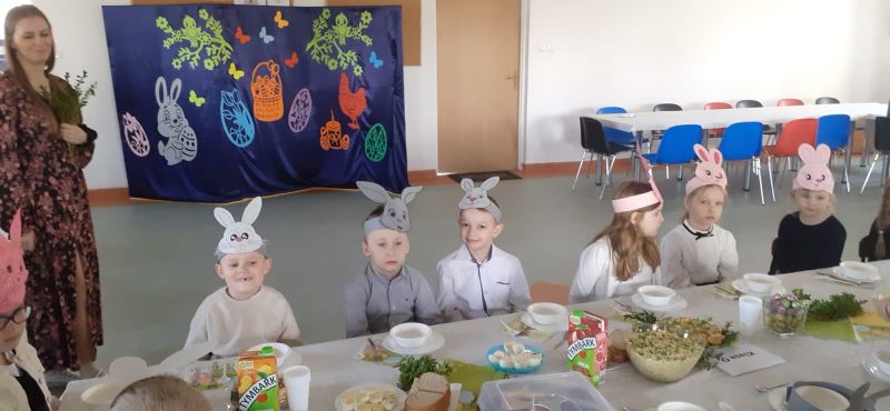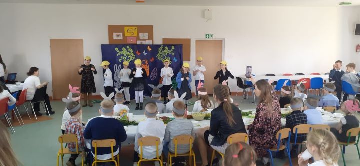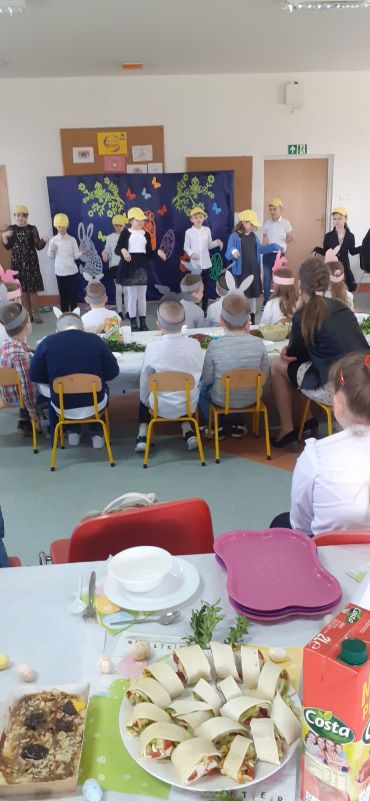 Spotkanie odbyło się przy tradycyjnym wielkanocnym śniadaniu, aby lepiej przybliżyć tradycje zbliżających się świąt. Na zajęciach z wychowawcą uczniowie wszystkich klas przygotowali potrawy świąteczne. Dzięki temu, pięknie udekorowany stół w świetlicy wiejskiej w Piecniku, zastawiony został pysznymi, tradycyjnymi potrawami. Wśród nich znalazł się żurek z białą kiełbasą i jajkiem ugotowany przez Radę Rodziców oraz przygotowane przez uczniów jajka faszerowane, sałatki, wielkanocne baby i babeczki. Zanim jednak wszyscy usiedli przy wspólnym stole uczniowie klasy V, I, II, III wraz z najmłodszymi członkami naszej szkolnej społeczności (przedszkolakami) wprowadzili nas w nastrój świąteczny śpiewając i recytując utwory związane z Wielkanocą.