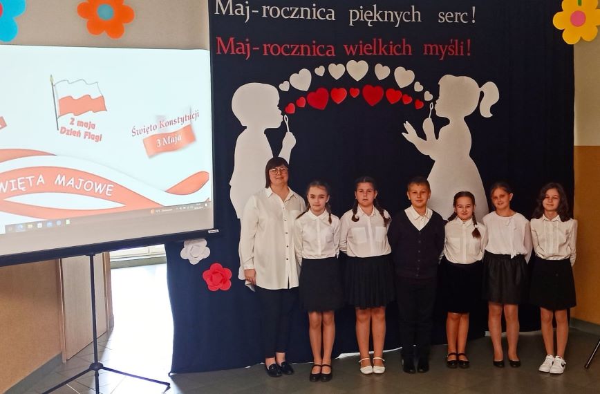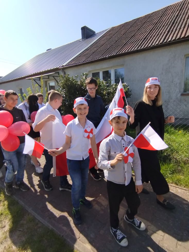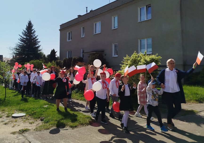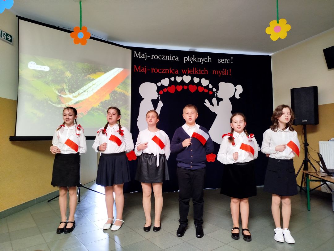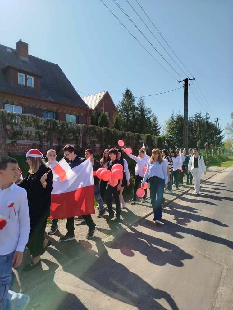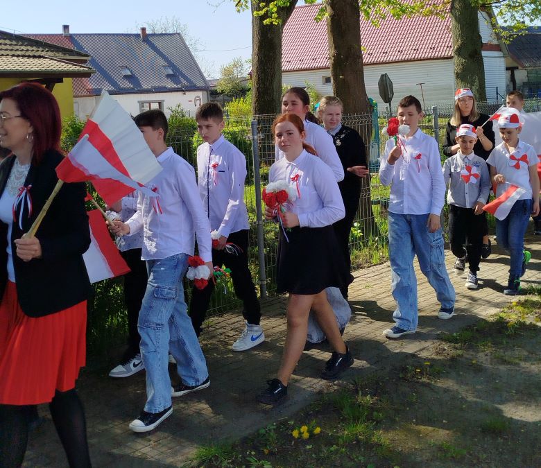Po odśpiewaniu ,,Mazurka Dąbrowskiego” na wspaniały program z cyklu: ,,Nic, co polskie, nie jest mi obce” w wykonaniu klasy czwartej, zaprosiła zgromadzonych znana szkolna spikerka – Tatiana Nicpoń. Aby uczcić te piękne i wyjątkowe w naszym kalendarzu majowe święta, przenieśmy się na chwilę z gmachu naszej szkoły do telewizyjnych wysłanniczek Gminnego Studia ,,Nowinki”: Zuzanny Kalinowskiej i Zuzanny Matusiak, które zrelacjonowały nam, w jaki sposób Polacy o tych świętach pamiętają. Ich pierwszym rozmówcą był pracownik kolei, w postać którego wcielił się Łukasz Szczepaniak. Przybliżył on Święto Pracy. O Konstytucji 3 Maja opowiedziały rezolutne uczennice: Tatiana Nicpoń i Martyna Haratym. Kolejnymi rozmówcami było starsze małżeństwo: Emilia Machczyńska i Łukasz Szczepaniak, które wspomniało o rocznicy zakończenia II wojny światowej, czyli o Dniu Zwycięstwa. Zaś informacje o Dniu Flagi Narodowej przybliżyły nam aktywne studentki, tutaj: Martyna Haratym i Tatiana Nicpoń. W trakcie trwania spektaklu słowno – muzycznego mieliśmy okazję wysłuchania jakże aktualnego i ważnego utworu muzycznego Chłopców z Placu Broni pt. ,,Wolność” oraz wzruszającej pieśni w wykonaniu uczniów klasy czwartej pt. ,,Taki kraj”. Po tym chwytającym za serce muzycznym przesłaniu, z uśmiechem na ustach, z pięknymi biało – czerwonymi symbolami w dłoniach i elementami garderoby, wyruszyliśmy ścieżkami Piecnika na tradycyjny pochód majowy. Spotkaliśmy się z bardzo miłą reakcją mieszkańców i osób przejeżdżających przez miejscowość.